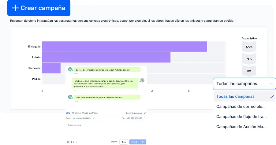 Bandeja de entrada única para responder SMS, correos y chats sin saltar entre aplicaciones.